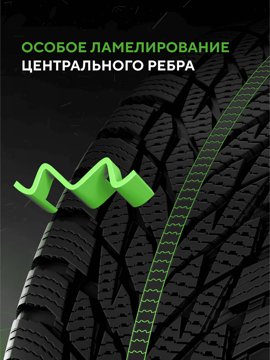 Улучшенное сцепление на скользких дорогах достигается за счет добавления в резиновую смесь мельчайших частиц с острыми гранями, которые проявляются на протекторе по мере износа. Отличная управляемость на льду и снегу.